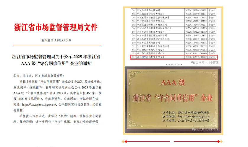 近日,浙江省市場監(jiān)督管理局發(fā)布《關(guān)于公示2025年浙江省AAA?級“守合同重信用”企業(yè)的通知》(浙市監(jiān)信〔2025〕3號),浙江川寧環(huán)保科技有限公司再次成功入選。公司自2019年7月首次斬獲浙江省守合同重信用AAA級企業(yè),2021年8月成功續(xù)評該稱號,此次2025?年再度入選。